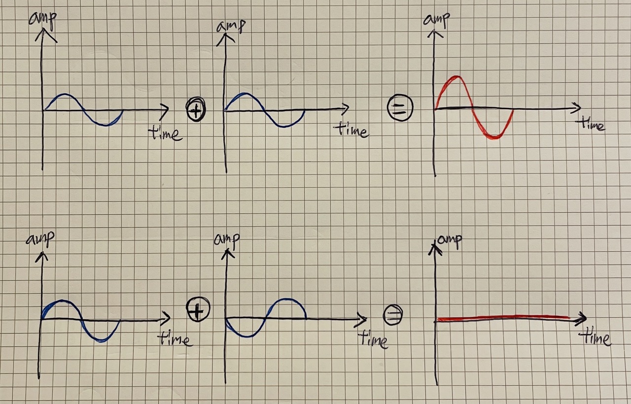 이 때 같은 부호의 진폭이 만나면 합해지고 다른 부호의 진폭이 만나면 서로 차감된다.