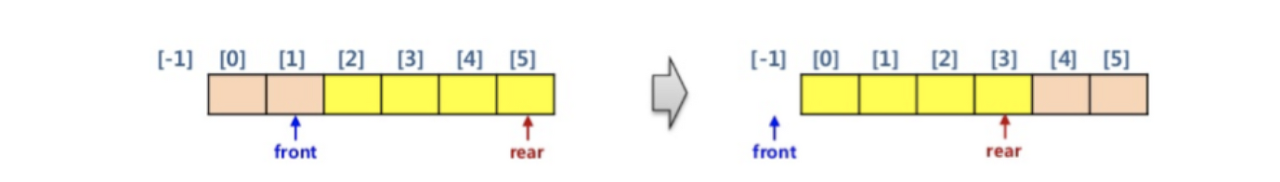 - front는 맨 첫번째 요소 바로 앞을 가리키고, rear는 마지막 요소를 가리킨다.