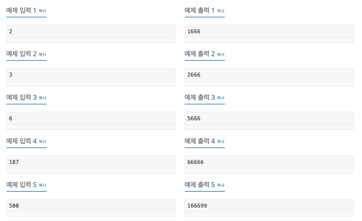 - 문제의 핵심은 666이 붙어있어야한다는 점. 즉 7번째 작품일 때 6666이 아니라 6660이어야 한다는 점이다.