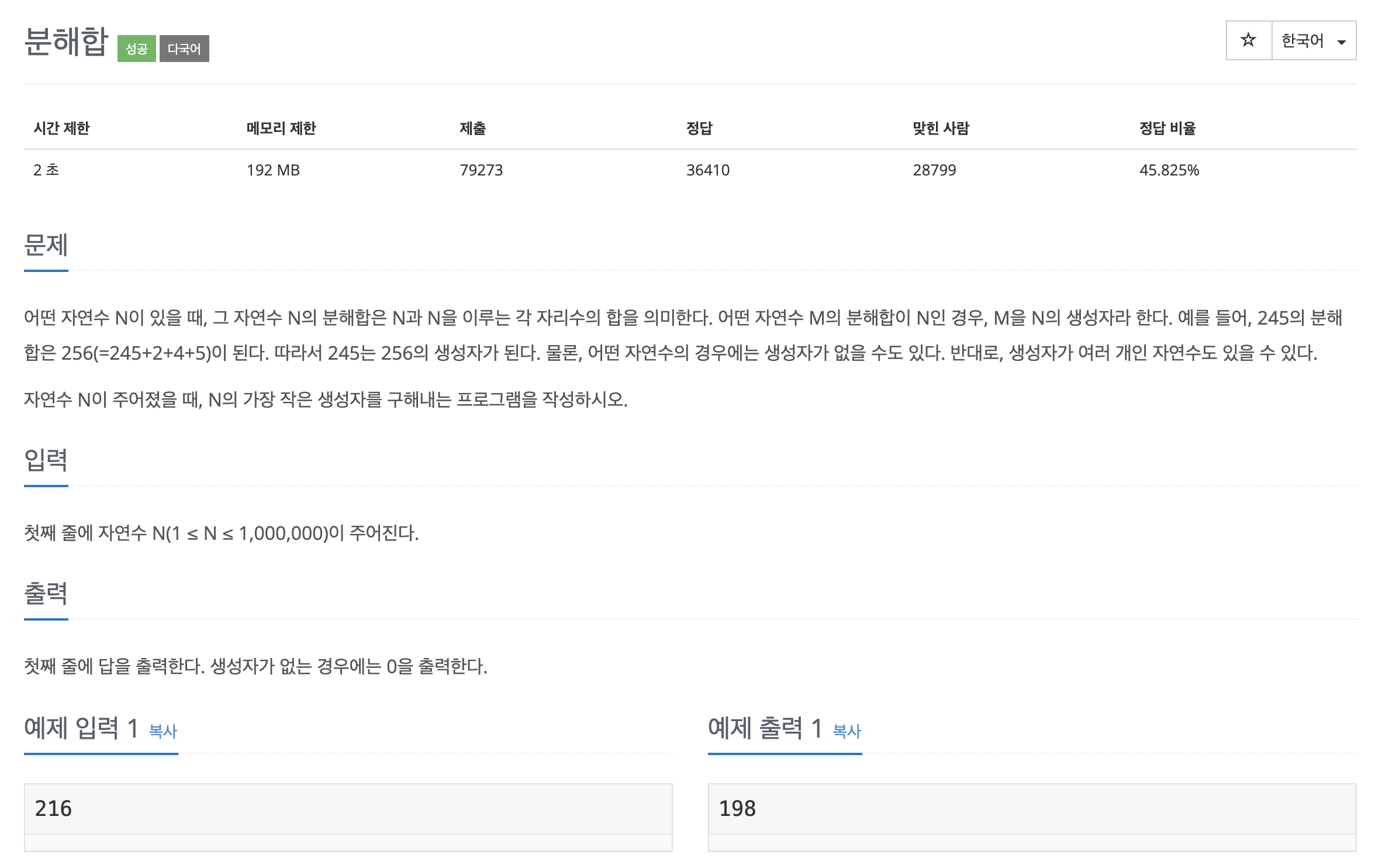 - 가장 작은 생성자를 구하는 문제 (분해합의 생성)